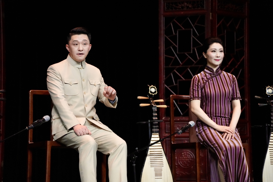 舞台上摒弃了时下流行的大屏影像,仅以极简的舞美留白,将观众的注意力完全聚焦于演员精湛的表演。导演徐伟将该作品比作一帧工笔人物画,在传统评弹的骨架上融入现代戏剧结构。舞台巧妙穿插了《东方红》《歌唱祖国》《我们走在大路上》等具有时代特征的旋律,而在人物内心独白的高光时刻,钢琴旋律与琵琶三弦形成微妙对话,深刻外化了金珍复杂的心绪。